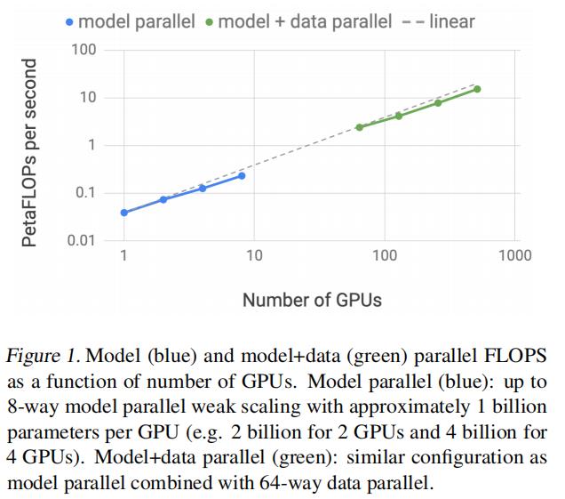 - We illustrate this approach by converging transformer based models up to 8.3 billion parameters using 512 GPUs. We sustain 15.1 PetaFLOPs across the entire application with 76% scaling efficiency when compared to a strong single GPU baseline that sustains 39 TeraFLOPs, which is 30% of peak FLOPs.