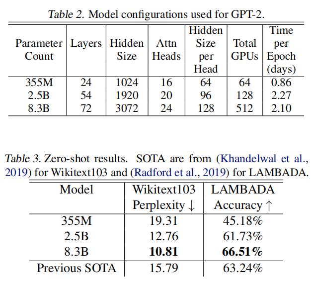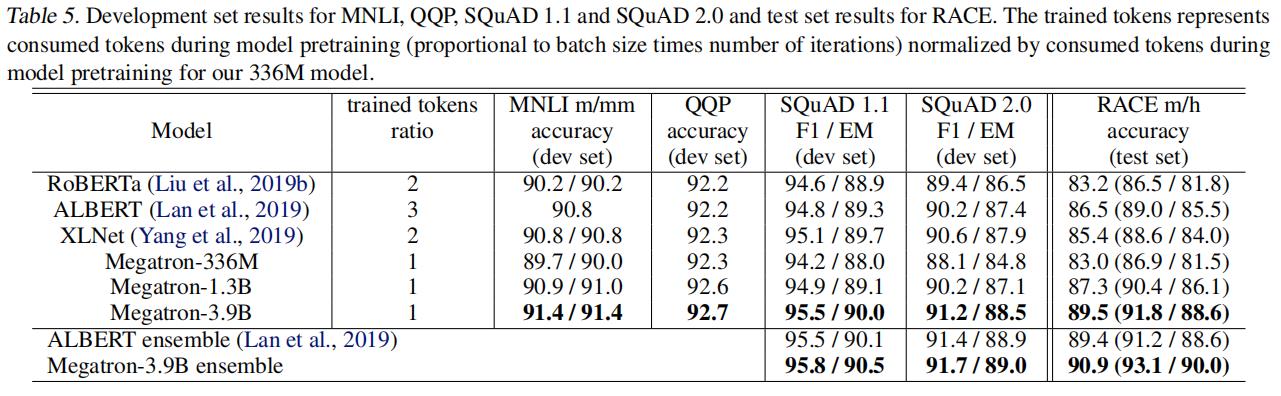 - To demonstrate that large language models can further advance the state of the art (SOTA), we train an 8.3 billion parameter transformer language model similar to GPT-2 and a 3.9 billion parameter model similar to BERT.We show that careful attention to the placement of layer normalization in BERT-like models is critical to achieving increased performance as the model size grows. Using the GPT-2 model we achieve SOTA results on the WikiText103 (10.8 compared to SOTA perplexity of 15.8) and LAMBADA (66.5% compared to SOTA accuracy of 63.2%) datasets. Our BERT model achieves SOTA results on the RACE dataset (90.9% compared to SOTA accuracy of 89.4%).