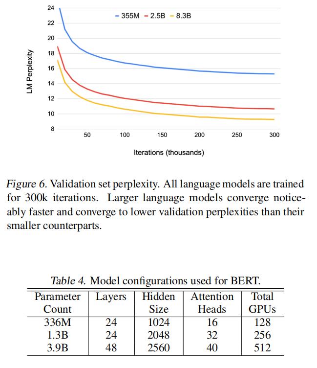 - We demonstrate that scaling the model size results in improved accuracies for both GPT-2 (studied up to 8.3 billion parameters) and BERT (studied up to 3.9B parameters) models.